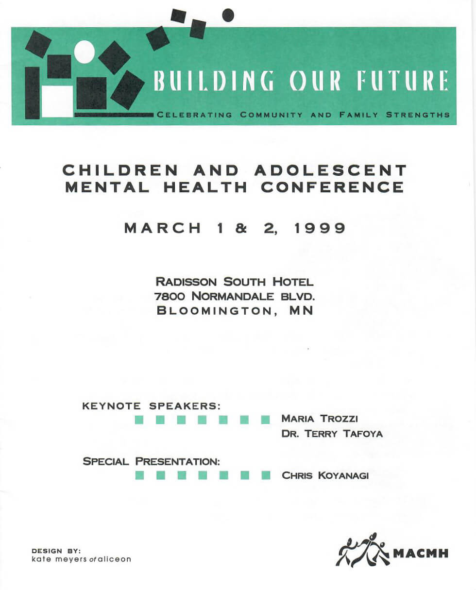 In 1999, MACMH hosted the 3rd Annual Child and Adolescent Mental Health Conference at the Radisson South Hotel in Bloomington. It focused on Building our Future, Communities & Families Working Together and hosted speakers Maria Trozzi and Dr. Terry Tafoya, with a special presentation from Chris Koyanagi.