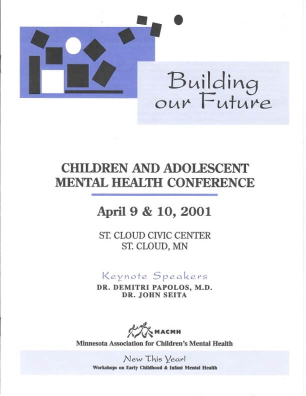 In 2001, MACMH hosted the 5th Annual Child and Adolescent Mental Health Conference at the St. Cloud Civic Center. It focused on Building our Future, Communities & Families Working Together, and hosted speakers Dr. Demitri Papolos and Dr. John Seita.